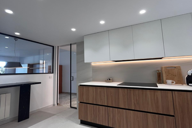 La cocina se presenta como el corazón del hogar, con una distribución abierta, líneas puras y un diseño que prioriza la comodidad sin renunciar al carácter. Los materiales, la iluminación y los volúmenes se integran con discreción, reforzando una atmósfera serena y contemporánea.