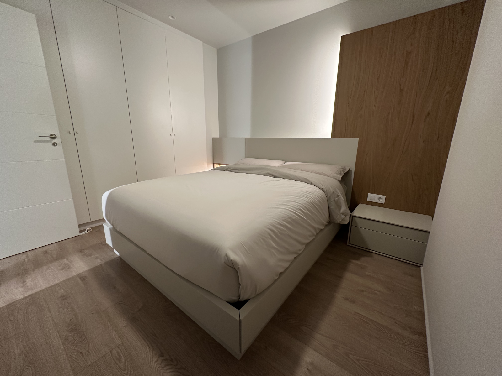 La madera vuelve a ser protagonista, esta vez en el cabecero retroiluminado que aporta calidez y profundidad.