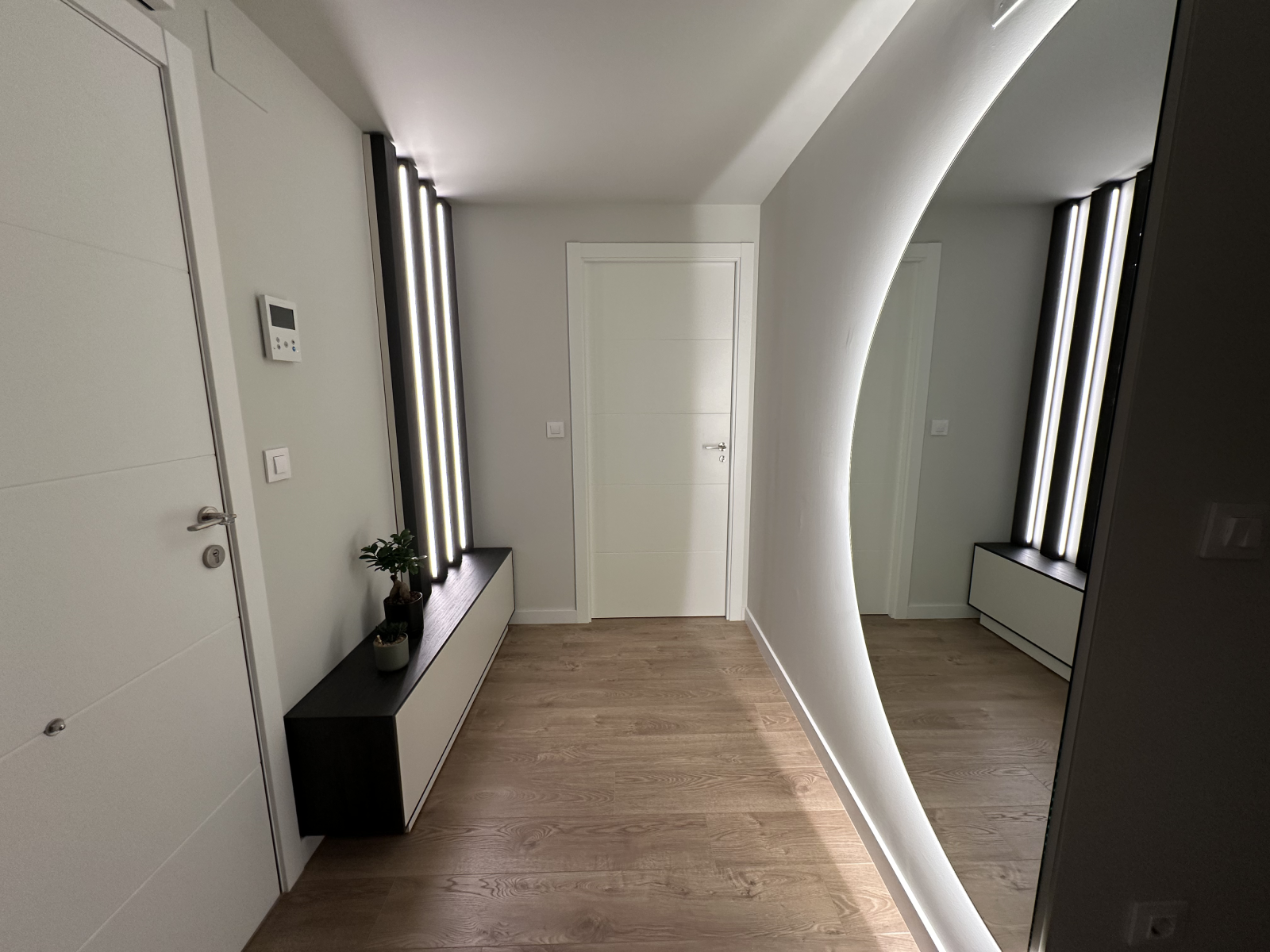 Un mueble bajo en tonos neutros, combinado con un panel vertical de lamas retroiluminadas, crea una composición escultórica que recibe con elegancia y calidez.