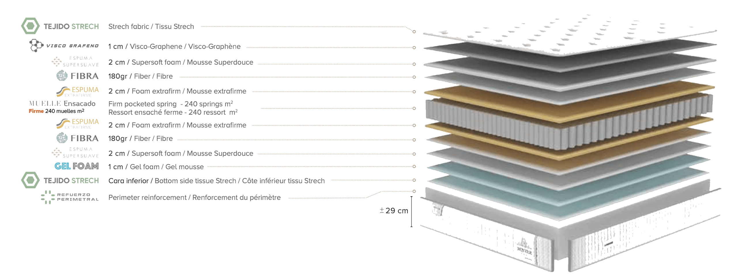 Su núcleo de Muelles Ensacados firmes divididos en 7 zonas de confort aportan un suporte idóneo para cada área de nuestra anatomía con espumaciones viscoelásticas diferentes en cada una de sus caras: invierno-verano.