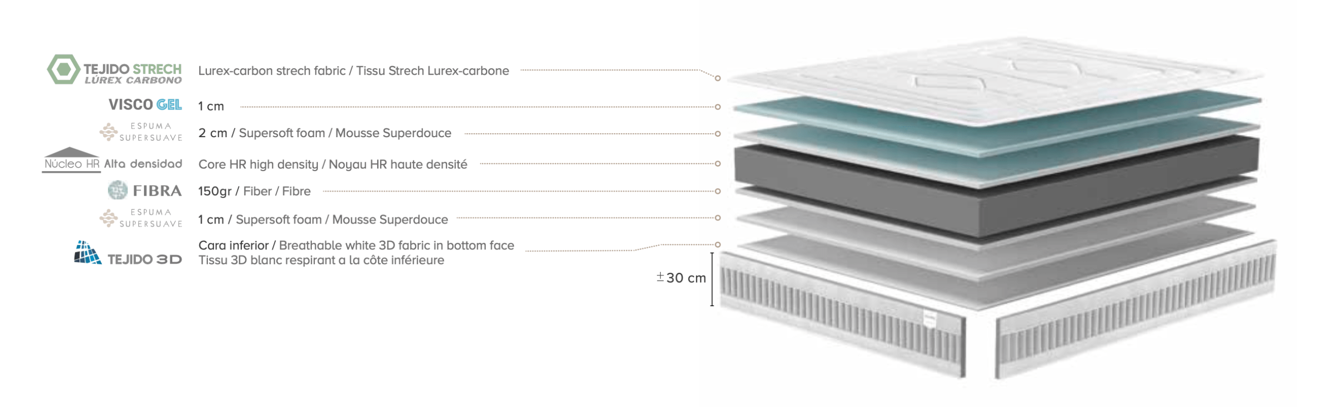 Sus acolchados con espumaciones exclusivas de ViscoGel y espumaciones de última generación hacen que el equipo de descanso se te acoja eliminando los puntos de presión y aportando una agradable sensación de frescor. Idóneo para personas calurosas.