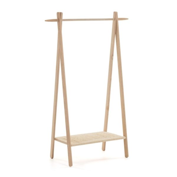 El abedul es el material principal del perchero burro Natane. Tiene un acabado blanqueado en toda la estructura. El colgador tiene dos piezas en cada punta, que también puedes usar para poner tus complementos. Además, también hay un estante hecho de cuerda de papel donde poder poner tu calzado.