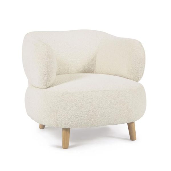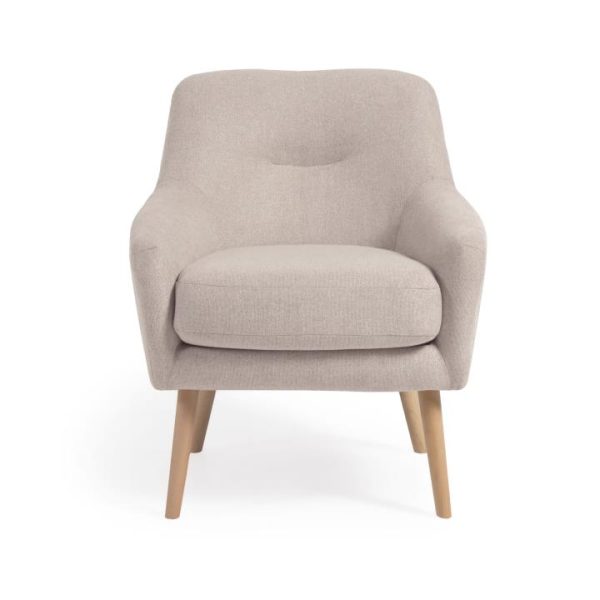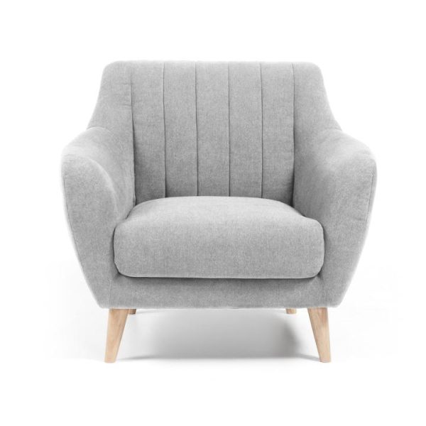 Butaca de estilo escandinavo tapizado en tela modelo Miss. Pespuntes decorativos en el respaldo. Pies de madera natural.