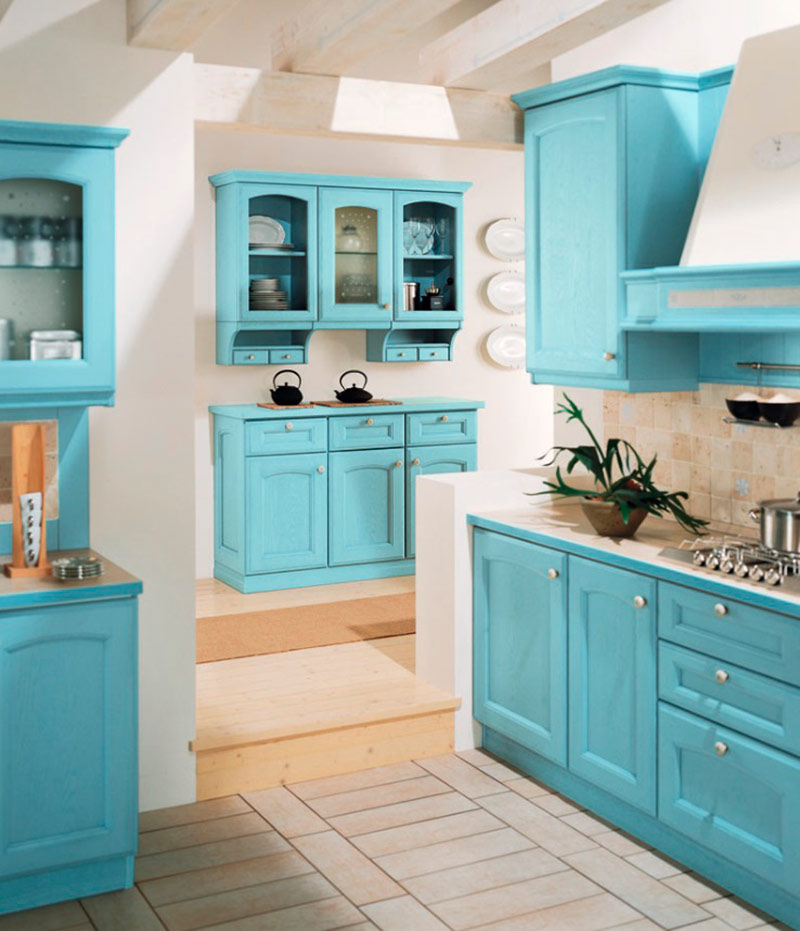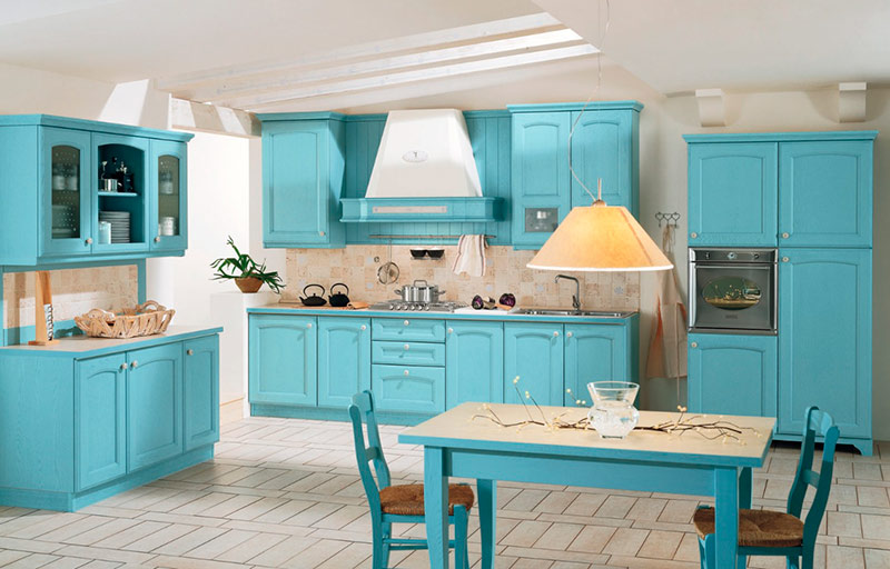 En este caso, elegiremos muebles de cocina azules, preferiblemente de una gama clara, que puede virar incluso a turquesa: una elección cromática basada en colores puros y tonalidades ligeras. Nos recordarán a esas cocinas típicas de las islas griegas, de la costa italiana y de nuestro litoral mediterráneo.