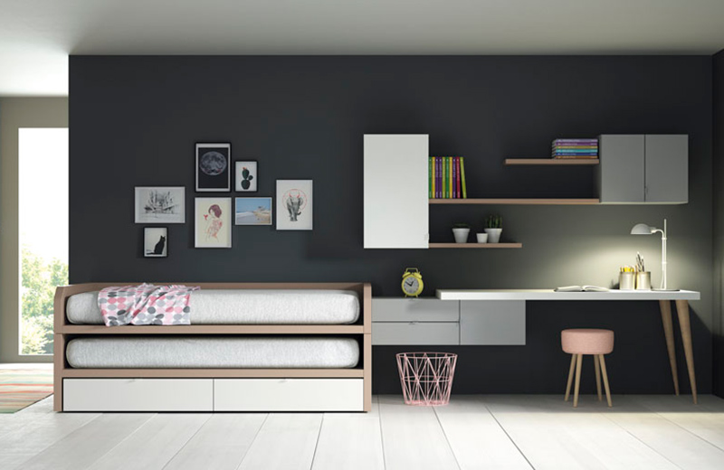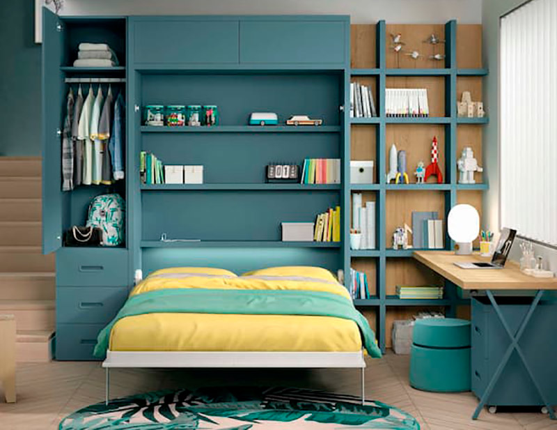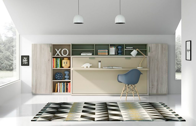 Una opción ideal cuando nos planteamos cómo decorar un dormitorio juvenil pequeño, es optar por una cama abatible. Y no, no pienses en esas camas abatibles antiguas que costaba una barbaridad colocar, o cuya ropa se desmoronaba cada vez que la abrías o la cerrabas. Eso ya ha pasado a la historia. Las camas abatibles de ahora cuentan con un sistema integrado que permite que cualquier persona pueda abrirlas y cerrarlas sin esfuerzo y con total comodidad.