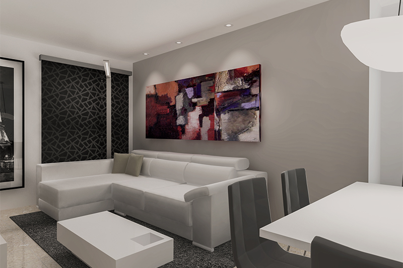 Luego, añadimos un sofá también de líneas rectas, tapizado en un cuero blanco, que va a juego con toda la composición.