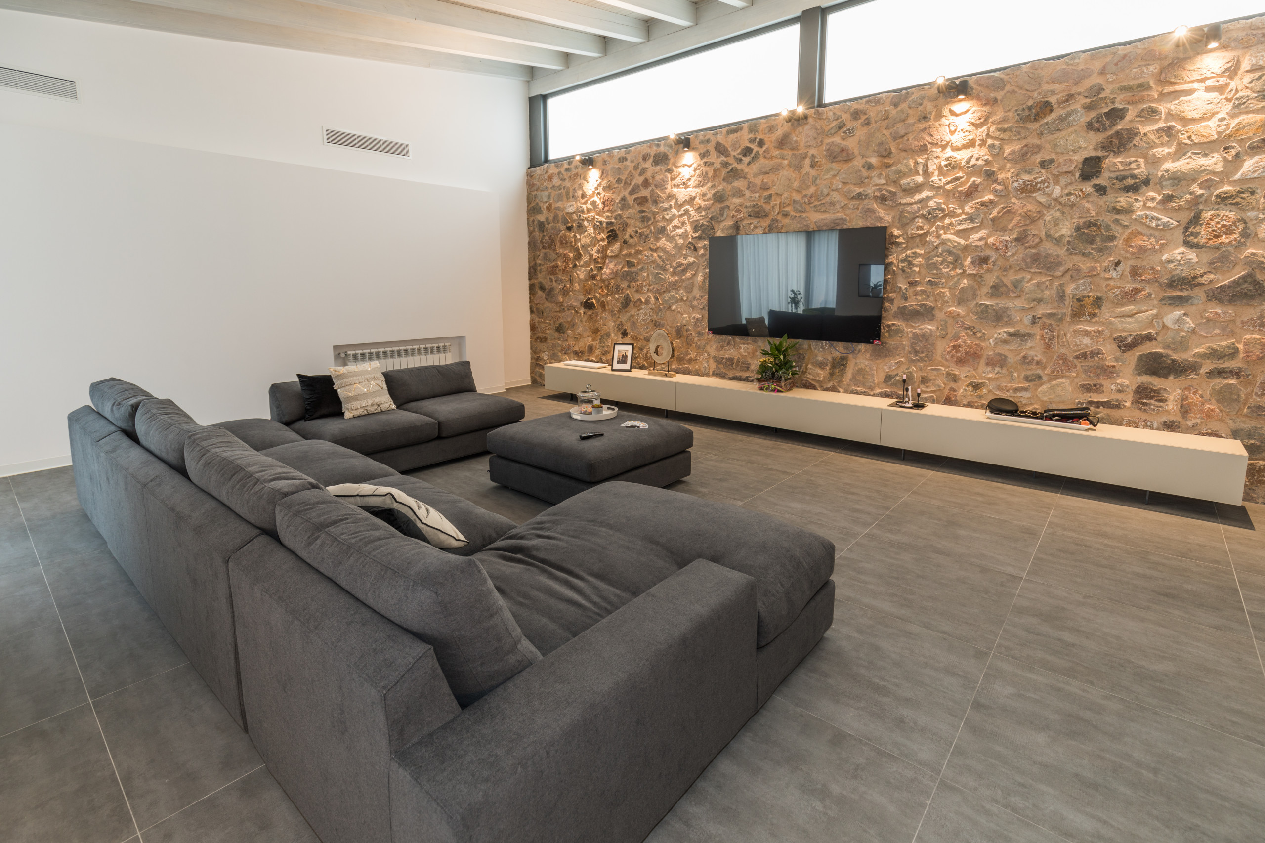 Este estilo se caracteriza por la utilización de paredes de piedra, ladrillo u otro material de mampostería, con detalles modernos como colores neutros, iluminación cálida, elementos de decoración modernos y minimalistas.