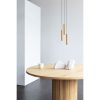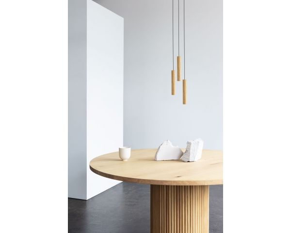 Consta de tres focos con soportes de madera de roble macizo, que cuelgan de un dosel de metal negro. Se pueden regular su altura de manera independiente, para crear la composición lineal o en racimo que más nos guste.