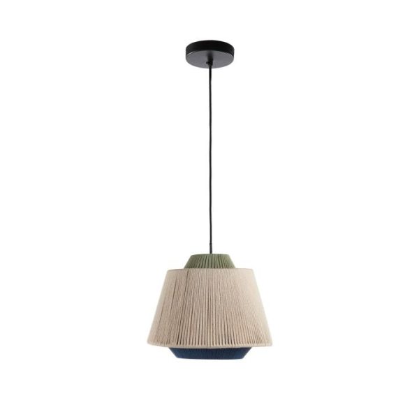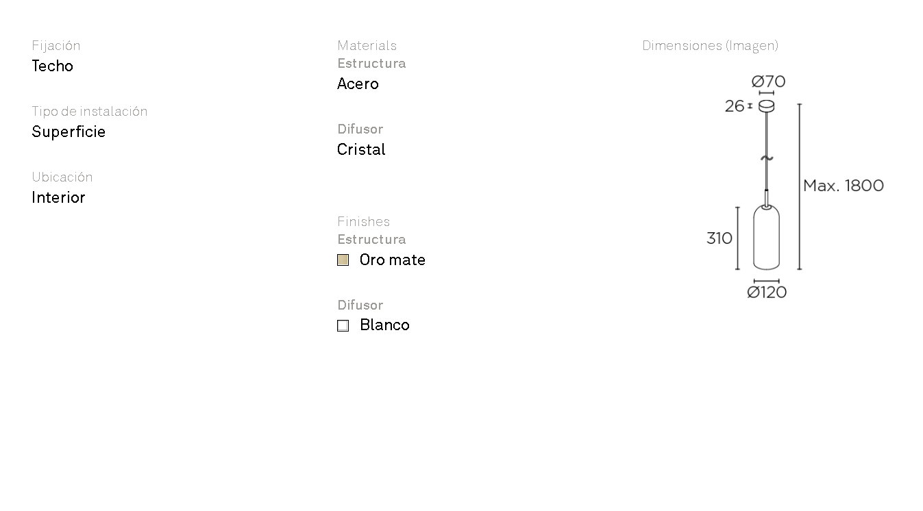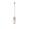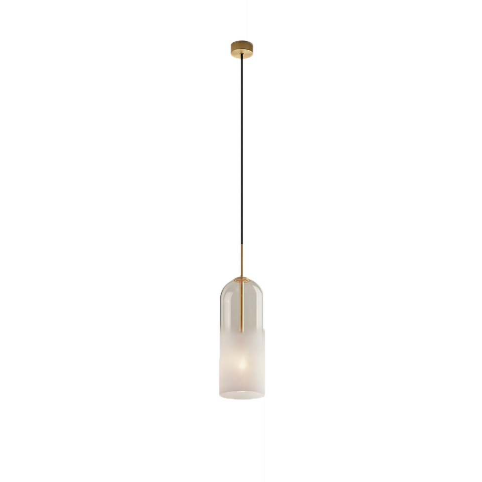 Lámpara colgante de diseño, con varilla dorada de acero y pantalla cilíndrica de vidrio blanco en la parte inferior, que se torna transparente a medida que asciende hacia la parte superior.